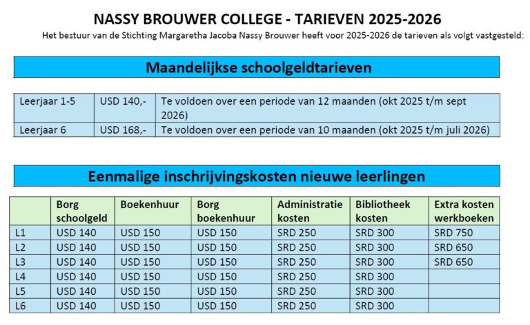 Voor het schooljaar 2025-2026 is het schoolgeld voor leerjaar 1 tot en met 5 vastgesteld op $140,- per kind per maand en voor leerjaar 6 $168 per kind per maand.